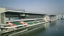 Kyōtei employs the flying start system of beginning races. Once competitors receive the signal to pit-out of the docks, they will maneuver their boats in an effort to secure a starting position while a large clock situated at the start/finish line begins a one-minute countdown. Starting positions are usually established with 30 seconds before the clock reaches zero, and with about 12 seconds remaining the boats begin to race up towards the start line at full speed.[4] Boats must cross the start line within one second after the clock reaches zero. Unlike typical powerboat racing, where if a boat crosses the line too early, there is a time penalty added to the offending boat, in Kyōtei, a false start (フライングスタート, furaingu sutāto, "Flying Start") or crosses too late - called a "Late Start" (出遅れ, deokure), will disqualify the boat, where it is scratched from the race and bets on that boat are refunded.[3] The Japanese term for this exclusion is "return absence" (返還欠場, henkan ketsujō). In a sense, the flying start system can be compared to the mobile start used in harness racing.