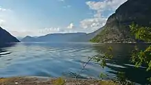 This fjord, known for its length, is one of the innermost branches of Sognefjorden. The fjord cuts into tall mountain masses with steep sides. On the fjord's eastern side, the Jotunheimen mountains rise to over 2,200 meters above sea level. The fjord also features lush bays and fjord banks with agriculture, including livestock, fruit, and berry cultivation. The bedrock of the region consists of Caledonian rocks.[3][4]