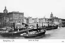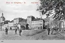 Löbenicht was the least powerful of Königsberg's three towns; unlike Kneiphof, Löbenicht was not a rival to Altstadt. Löbenicht's small Freiheiten suburbs were Anger to the east and Stegen to the southeast.[3] These districts were granted to Löbenicht by Grand Master Frederick of Saxony in 1506. Anger contained Löbenicht's warehouses (see also Lastadie)[4] and farmland.[5] Stegen (or Steegen), originally used for lumber, developed into the Neuer Markt (new market).[6] Outlying villages and estates eventually controlled by Löbenicht included Ponarth, Maraunen, Quednau, Radnicken, and the tile factory near the Oberteich.[7] Aside from Anger and Stegen, Löbenicht was bordered by Burgfreiheit to the north, Rossgarten to the northeast, Neue Sorge to the east, Sackheim to the southeast, and Altstadt to the west.[8]