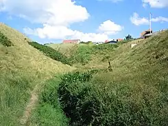 Just south of Lønstrup is the site of the former Mårup Church, a medieval church that was partially dismantled in 2008 after hundreds of years of coastal erosion had endangered the church. Built around 1250, it may have originally been 1 kilometer (0.62 mi) from the coast, but erosion had put the sea just meters away.[3] South of that is another abandoned structure, the Rubjerg Knude lighthouse. Partially buried in sand, the lighthouse was built at the turn of the 20th century.