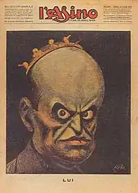 The publication opposed Mussolini's Fascist dictatorship and was forced to suspend publication in the spring of 1925 due to a new law restricting press freedom and after a long series of threats, harassment and interventions of fascist gangs in the newsroom.[2][3] For the cover of the final issue of L'Asino, Galantara made a caricature of Mussolini, entitled Lui (Him) that would become a role model of foreign designers worldwide. Mussolini appeared with a huge bald head and surmounted by a crown on which is written "trouble to anyone who touches me", a huge mouth and two big eyes wide and crossed by a light of madness.[7]