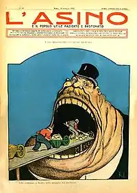 L'Asino (The Donkey) was an Italian magazine of political satire founded in Rome in 1892, by Guido Podrecca (1865–1923) and Gabriele Galantara (1867–1937), a former mathematics student, designer and cartoonist, both with a socialist background. The two took the pseudonyms "Goliardo" (Podrecca) and "Ratalanga" (Galantara), and with these nicknames signed the outputs of the weekly. The magazine's title was from a saying of Francesco Domenico Guerrazzi that said that "the donkey is like the people: useful, patient and stubborn" (in Italian: "come il popolo è l'asino: utile, paziente e bastonato), which became the subtitle and the motto of the editors.[2][3][4]