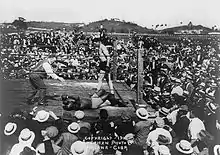 Weber was one of the sponsors of a film made of a boxing match in Havana, Cuba, on 5 April 1915 between Jack Johnson and Jess Willard. He obtained the copyright on the film.[5] He was refused permission to import it on the basis of a Federal law prohibiting import of such films for public exhibition.[6][lower-alpha 1] Weber argued that this law was not constitutional, since it infringed on the rights of states. The case was heard in the Supreme Court in December 1915, and decided against Weber.[6] In 1916, Weber made a widely publicized attempt to bypass the restriction. He set up a motion picture camera 8 inches (200 mm) south of the border between New York and Canada, pointing to a screen on the Canadian side on which each frame of the film of the 1915 Havana fight was projected, thus creating a duplicate negative. He lost the court case that followed on the basis that he had violated the spirit of the law.[7]