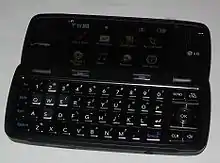 The LG VX10000, also known as the Verizon Voyager or LG VX10K, is an Internet-enabled multimedia phone designed by LG Electronics and carried by Verizon Wireless in the US, Telus, and Bell Mobility in Canada, and Reliance in Asia. The external screen is touch enabled with a virtual keyboard and buttons. It features an internal screen for use with the included full QWERTY keyboard. Both screens of the Voyager have WQVGA resolution. The Voyager's functions include those of a camera phone and a portable media player, in addition to text messaging, and Internet services including e-mail and web browsing. It is a dual-band mobile phone that uses the CDMA standard. It supports the EVDO data technology.
