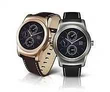 The LG Watch Urbane is a smartwatch released by LG Corporation on April 27, 2015.[1] There are gold and silver models, each with a 22mm-wide interchangeable strap. The watch has IP67 dust and water resistance.[2]