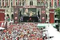 The first concert of LaBrassBanda was in London. During the European football championship in 2008 the band played concerts on their trailer at different fan miles. The biggest gig they had was in Vienna at the final. They also played at the 'Bavaria Open' in Munich. In 2009 the band was invited by the Goethe-Institut to take part in the German Culture Festival sibSTANCIJA_09 in Nowosibirsk and Akademgorodok. There were further concerts in Omsk, Krasnoyarsk and Moscow.[2] In the same year LaBrassBanda appeared at the Harare International Festival of Arts in Zimbabwe, organized by the German Embassy and the Zimbabwe German Society,[3][4] and at the Roskilde Festival.[5]