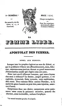 The first issue titled La Femme libre bore the subtitle Apostolat des femmes (Apostolate of women) but did not include a publication date. It consisted of eight pages, including the cover. There was a single article, titled "Appel aux femmes" (Call to women), organized into three parts, each signed with a first name. The first issue announced a second one to be published on August 25. The first signature, Jeanne-Victoire, is attributed to a linen worker who became a teacher, Jeanne Deroin. After pleading the place of women, she makes a link with the Saint-Simonian movement and Barthélemy-Prosper Enfantin, "Nous sommes libres et égales à l'homme ; un homme puissant et juste l'a proclamé, et il est compris de beaucoup qui le suivent" (We are free and equal to man; a mighty and righteous man has proclaimed it, and it is understood by many who follow him.) She ends with an appeal to "Femmes de la classe privilégiée ; vous qui êtes jeunes, riches et belles" (Women of the privileged class; you who are young, rich and beautiful) and to "Femmes de toutes les classes, vous avez une action puissante à exercer" (Women of all classes, you have a powerful action to exercise). This is followed by the two founders, Véret and Guindorf. To end this first issue of La Femme Libre, a postscript specifies the exclusively feminine character of the publication by excluding the possibility of an article written by a man. This small feminist newspaper, a pioneer of the women's press, quickly evolved and continued its publication until 1834. Thirty-one issues were published.[4]