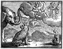 In the later books, the so-called Indian Bidpai is drawn upon for oriental fables that had come to the French through translations from Persian. The most likely source for La Fontaine was the pseudonymous version by Gilbert Gaulmin (1585–1665) under the title The book of Enlightenment or the Conduct of Kings (French: Le Livre des lumières ou la Conduite des Roys, composée par le sage Pilpay Indien, traduite en français par David Sahid, d’Ispahan, ville capitale de Perse; 1644). Another translation by Father Pierre Poussines appeared in 1666 with the Latin title Specimen sapientiae Indorum veterum (A sample of ancient Indian wisdom). With a genealogy going back to the Indian Panchatantra, they were then attributed to Bidpai (Pilpay), who is given more than his fair due by La Fontaine in the preface to his second collection of Fables: "I must acknowledge that I owe the greatest part to Pilpay, the Indian sage." (French: Je dirai par reconnaissance que j’en dois la plus grande partie à Pilpay sage indien.)[1] His sources are in fact much more diverse and by no means mainly oriental; of 89 fables, no more than twenty are found in Bidpai's collection.[2]
