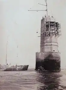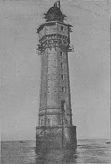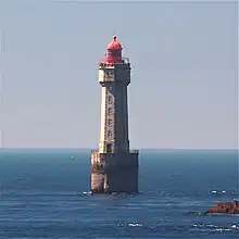La Jument ("the mare") is a lighthouse in Brittany, Northwestern France.[1] The lighthouse is built on a rock (that is also called La Jument) about 300 metres from the coast of the island of Ushant. There is also a very different lighthouse about 3 kilometres to the North, the Nividic lighthouse. Together with the Kreac'h lighthouse, they are the three most famous lighthouses of the region. It was listed as a historic monument in 2017.[2]