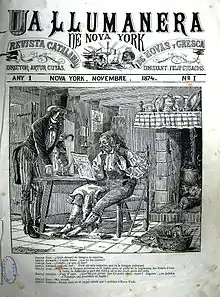 La Llumanera de Nova York was a monthly illustrated publication, edited in Catalan in New York by writer Artur Cuyàs i Armengol, and illustrated by Felip Cusachs, in a delicate moment for the relationship between Spain and Cuba, and the puissance of the Catalan Renaixença.