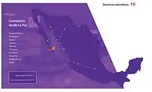 ![]() La Paz Domestic destinations from La Paz International Airport Red = Year-round destination Blue = Future destination Green = Seasonal destination |