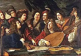 Jean-Baptiste Lully (holding the violin) surrounded by musicians at the court of Louis XIV. La Petite Bande takes its name from Lully's orchestra, La Petite Bande des Violons du Roi. (Painting by François Puget, 1688.)