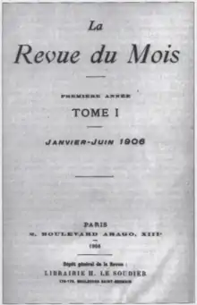 La Revue du mois was a scientific and literary journal founded in 1906[1] by Émile Borel and his wife Marguerite Appell (called Camille Marbo). Its editorial board included Jean Perrin, Paul Langevin, Aimé Cotton, Jacques Duclaux, Henri Mouton, Robert Lespieau, Noël Bernard and Louis-Jacques Simon. Léon Blum, Paul Painlevé and Édouard Herriot also participated in this magazine.[2]