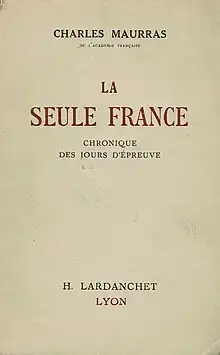 In the spring of 1941, Maurras published La Seul France. Chronicle of the days of trial, first book of reflection since the collapse of June 1940.[3] The book is dedicated to Marshal Pétain and proclaims his support for the Révolution nationale, judged as the country's only hope for recovery.