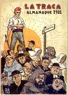 The magazine featured satirical material written in the Valencian dialect.[2] In 1931 the language of the magazine was switched to Spanish after which it sold more than half a million copies.[2][3] One of the contributors of La Traca was the illustrator Gaspar Méndez Álvarez whose anticlerical and political writings were published from 1928.[4]