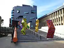 The LIMS1 building is an 11,000-square-metre (120,000 sq ft), six-storey, molecular sciences research hub containing 34 laboratories, with research, support and teaching facilities. It is interconnected with the LIMS2 building, an existing adjacent building, allowing co-location of research and support staff. The building's lower levels accommodate undergraduate learning spaces, with open, flexible laboratories (accommodating up to 160 students) connected to “dry” teaching rooms. The top three levels of the building contain large interdisciplinary laboratories shared by multiple research teams. The cellular facade features chromosomal design features that reflect the molecular research undertaken within the building, and is surrounded by landscaped courtyards.[19][24] The LIMS1 building has achieved formal certification for 5 Star Green Star (Design) using the Education Tool Version 1 through the Green Building Council of Australia.[25] Melbourne-based Indigenous artist Reko Rennie was awarded an A$200,000 commission to create 'Murri Totems', an installation located at the entrance of the LIMS building.[26] The artwork consists of four 4.5-metre (15 ft) vertical structures incorporating the five platonic forms – icosahedron, octahedron, star tetrahedron, hexahedron and dodecahedron – and painted with Rennie's traditional pattern.[21]