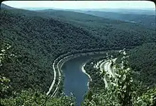 The DL&W was one of the most profitable corporations in the U.S. when it built the Cut-Off.[4][28] That profitability declined sharply after World War II, leading to the 1960 merger with the Erie Railroad.[29] DL&W single-tracked the Cut-Off in 1958 in anticipation of the Erie merger. The westbound track was removed, leaving a four-mile (6.4 km) passing siding at Greendell and shorter sidings at Port Morris and Slateford. After the merger, most freight traffic shifted to the Erie's mainline through Port Jervis, New York.[30][31] With the cessation of passenger service in 1970, the Cut-Off became relatively quiet for several years. In 1972, the CNJ abandoned operations in Pennsylvania, causing through freights to be run daily between Elizabeth, New Jersey, and Scranton, using the Cut-Off and the CNJ's High Bridge Branch. (This arrangement with the CNJ would end on April 1, 1976, with the creation of Conrail).[31] As such, when Penn Central closed its Maybrook, New York Yard in 1970, and its ex-New York, New Haven and Hartford Railroad Poughkeepsie Bridge burned on May 8, 1974, the original reason for using the "Erie side" suddenly no longer existed. As a result, the EL looked to upgrade the "Scranton side", and by 1974 nearly all EL freights had been re-routed to the Scranton Division via the Cut-Off.[31]