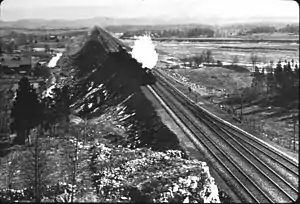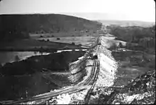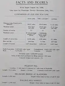 When it opened on December 24, 1911, the Cut-Off was considered a super-railroad, a state-of-the-art rail line, having been built using large cuts and fills and two large concrete viaducts, allowing what was considered high-speed travel at that time. It was 11 miles (18 km) shorter than the Lackawanna Old Road, the rail line it superseded; it had a much gentler ruling gradient (0.55% vs. 1.1%); and it had 42 fewer curves, with all but one permitting passenger train speeds of 70 mph (110 km/h) or more.[2] It also had no railroad crossings at the time of its construction. All but one of the line's 73 structures were built of reinforced concrete, a pioneering use of the material.[3] The construction of the roadbed required the movement of millions of tons of fill material using techniques similar to those used on the Panama Canal.[4]