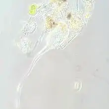 Lacrymaria olor is a species of ciliates, typically 100 micrometres (0.10 mm) long, that is found in freshwater ponds. Its name means "swan tear" in Latin, and refers to its general shape: namely, a teardrop-shaped cell with a small "head" at the end of a long slender "neck". The protist is notable for its ability to extend the anterior end of the cell up to 7 times its body length, and manipulate in many directions — even around obstacles — in order to capture its food.[1] For that reason it is a popular subject for amateur microscopists. The classification has been attributed to Müller (1786).[2]