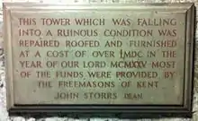 The cathedral fabric required continuous care: in 1664 the south aisle was recased and in 1670 40' of the north aisle had to be rebuilt.[40] In 1679 the spire was in a dangerous state and an architect, Samuel Guy, reported on it. He reported that £1,000 of work was needed, however a few months later a Westminster carpenter, Henry Fry, took a different view: some lead work and the repair of one beam was sufficient. £160 was spent on the organ. In 1705 work started to relead the roof, completed by 1724. In 1730 the old ringers' loft above the quire steps was removed and the crossing vaulted. Between 1742 and 1743 major work was undertaken in the quire, sufficiently disruptive that the dean and chapter used nearby St Nicholas' Church. In 1749 the steeple had to be rebuilt and between 1765 and 1772 the west front towers were rebuilt.[44]