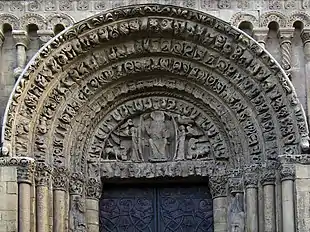 The west front is dominated by the central perpendicular great west window. Above the window the dripstone terminates in a small carved head at each side. The line of the nave roof is delineated by a string course above which rises the crenellated parapet. Below the window is a blind arcade interrupted by the top of the Great West Door. Some of the niches in the arcade are filled with statuary. Below the arcade the door is flanked with Norman recesses. The door itself is of Norman work with concentric patterned arches. The semicircular tympanum depicts Christ sitting in glory in the centre, with Saints Justus and Ethelbert flanking him on either side of the doorway. Supporting the saints are angels and surrounding them are the symbols of the Four Evangelists: Ss Matthew (a winged man), Mark (a lion), Luke (an ox) and John (an eagle).[52] On the lintel below are the Twelve Apostles and on the shafts supporting it King Solomon and the Queen of Sheba.[53] Within the Great West Door there is a glass porch which allows the doors themselves to be kept open throughout the day.