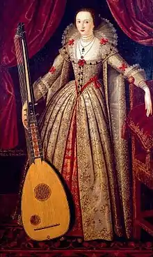 Because her father, Robert Sidney, was governor of Flushing, Wroth spent much of her childhood at the home of Mary Sidney, Baynard's Castle in London, and at Penshurst Place. Penshurst Place was one of the great country houses in the Elizabethan and Jacobean period. It was a centre of literary and cultural activity and its gracious hospitality is praised in Ben Jonson's famous poem To Penshurst. During a time when most women were illiterate, Wroth had the privilege of a formal education, which was obtained from household tutors under the guidance of her mother.[3] With her family connections, a career at court was all but inevitable. Wroth danced before Queen Elizabeth on a visit to Penshurst and again in court in 1602.[4] At this time a likeness of her as a girl in a group portrait of Lady Sidney and her children was painted by Marcus Gheeraerts the Younger in 1596, and is now on display at Penshurst.[3] As a young woman, Lady Mary belonged to Queen Anne’s intimate circle of friends and actively participated in masques and entertainments.[5]
