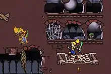 Lady Sia is a traditional platformer with action-adventure elements. As such, players have to watch out for numerous enemies as well as make sure not to fall off of the platforms.[4] The world Sia must cross is divided into four areas, each of which are divided into four levels, a main boss fight, and a bonus level.[4] Levels focus on either fighting or acrobatics. Sia has three lives per level, but the player can temporarily acquire more by collecting gems. If the player loses a life, he or she must restart at the beginning of the level or at the last checkpoint. Checkpoints are found halfway through each level and usually depicted as golden whirlwind images that turn into an image of Sia when activated. If all lives are lost, Sia is "thrown in jail" and the player receives ten seconds to decide whether to restart the level or quit.