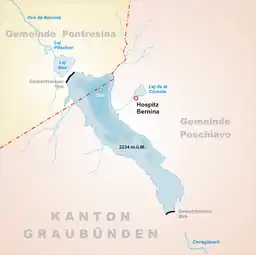 The summit of the Bernina railway line, which is the highest mountain crossing railway in Europe, runs alongside the eastern side of the lake, with the Ospizio Bernina station at roughly the mid-point. The road across the Bernina pass (Hauptstrasse 29) follows a higher route on the same side of the lake. Most of the lake lies within the municipality of Poschiavo, although the most northerly section and the northern dam lie within the municipality of Pontresina.[1]