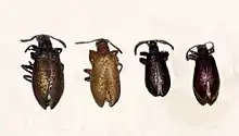 Lagria cuprina can reach a length of about 9 millimetres (0.35 in). Body is oblong, prothorax is almost square, thorax and prothorax are densely punctuated. Elytra are reddish or coppery.[3]