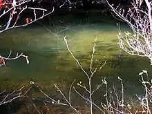 Lagunitas Creek's major tributaries include San Geronimo Creek, Devils Gulch, Nicasio Creek, and Olema Creek.[7] The creek's source is the northern slope of Mount Tamalpais, a few miles (~6–8 km) east of Bolinas Lagoon. The creek begins as three forks, the East Fork, Middle Fork and West Fork. After about a mile (1,600 m), they all flow into Lake Lagunitas, which drains into Bon Tempe Lake, which drains into Alpine Lake. Downstream of Alpine Lake, the creek flows roughly northwest until it reaches Kent Lake. Just downstream of Kent Lake, San Geronimo Creek joins the creek, right before it forms the Inkwells. Lagunitas continues northwest through Samuel P. Taylor State Park and is joined by Nicasio Creek, which flows from Nicasio Reservoir, another water storage reservoir. Shortly after this confluence, Lagunitas turns westward and flows through the town of Point Reyes Station. On the west side of the town, the creek is joined by Olema Creek, the largest tributary in the Lagunitas Creek watershed. Olema Creek receives Bear Valley Creek, and mainstem Olema Creek flows for 9 miles (14 km) along the San Andreas Fault Zone, with a catchment area of 14.5 square miles (38 km2).[5] After receiving the waters of Olema Creek, Lagunitas Creek turns northward and then empties into the wetlands at the southeast end of Tomales Bay.
