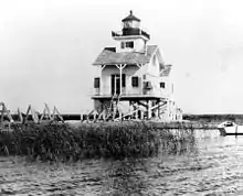 The Lake Borgne Light was a lighthouse in Mississippi at the entrance to Lake Borgne on what is now Lighthouse Point, east of Heron Bay. It was built in 1889 to replace an earlier light on St. Joseph's Island further east, which was shrinking and is now completely gone.[2] The new light sat on a screwpile foundation in the marsh and was reached by a boardwalk; it was equipped with a fifth order Fresnel lens. The house was destroyed by the 1906 Mississippi hurricane but was rebuilt; it was deactivated in 1937 and abandoned.[2] The foundation of the light is marked as a hazard on present day charts, as the point of land has eroded further.[3]