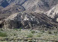 Bat Caves Butte and Obsidian Butte formed islands in the lake when it was full[31] although during highstands the latter was submerged.[32] Relatively straight northwest–southeast trending eastern shores faced from northwest to southeast the Indio Hills, the Mecca Hills, the Orocopia Mountains, the Chocolate Mountains and the East Mesa. The less regular western shore faced the Santa Rosa Mountains towards north and the Fish Creek Mountains and Vallecito Mountains farther south.[17] Earlier lake stages may have extended into the Jacumba Mountains as well.[33]