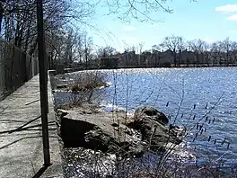 The water from this reservoir flows by gravity to the southern, low level district of the city. There is a steel equalizing tank 34 ft (10 m) high by 44 ft (13 m) in diameter connected with this system on high ground 2 miles (3.2 km) south of the dam.[3] The dam, which impounded 300 million gallons of water, cost $60,000 to build. While at first, the water supplied New Rochelle exclusively, two additional dams were constructed so that the water could also be routed to Pelham, Eastchester, and elsewhere.[2]