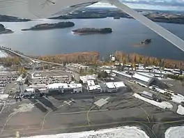 ![]() Aerial view looking west of Kuopio Airport terminal and apron. Siilinjärvi in far background, across Lake Iso-Jälä. | |