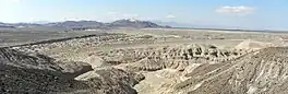 The Mojave River entered the lake from the west, probably forming a river delta.[30] The most recent drainage from the lake was Afton Canyon, which drained the lake east towards Soda Lake, Silver Lake and eventually Death Valley.[31] This draining cut 120 metres (390 ft) deep into the sediments of Lake Manix, removing about 2.815 cubic kilometres (0.675 cu mi) of material and depositing it below Afton Canyon.[32] The erosion has exposed sediments of Lake Manix, making their climatic records accessible to research.[33]