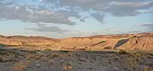 The lake existed at least until 14,230 ± 1,325 years before present.[48] Lake Manix drained when the Afton Canyon formed,[32] possibly around 13,800 years before present;[82] an earlier estimate of 14,000 years ago was later discarded.[83] An alternative date is about 25,000 years before present.[11] This emptying may have been quick, draining Lake Manix within a short time,[82][84] perhaps as little as ten hours.[85] The draining probably contributed to the "Lake Mojave II" highstand.[40] After the initial catastrophic cutting, a slower incision further deepened the Afton Canyon.[26] Alternative theories assume a much slower formation of the Afton Canyon outlet,[16] based on the presence of several terraces and possible recessional landforms.[85] As of 2003, the formation speed question was still not settled.[86][87] The formation of the path to Afton Canyon was probably aided by the Manix Fault, which had left easily eroded sediments.[5] The Mojave River may have drained into the Coyote Basin even after the formation of Afton Canyon[5] under the influence of faulting[88] until headward erosion cut off that basin from the river flow about 9,000–7,500 years ago.[86] Sediments transported through Afton Canyon during the event and afterwards have buried the landscape beneath Afton Canyon, potentially also contributing sand to the development of the Kelso Dunes.[31]