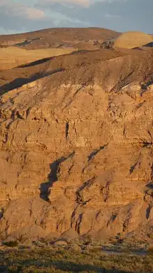 Bird species whose skeletons have been found in sediments of Lake Manix include the western grebe and the white pelican.[2] Other bird skeletons found there have been attributed to the species Aquila chrysaetos (Golden eagle),[60] Branta canadensis (Canada goose),[61] Ciconia maltha (an extinct stork),[62] Erismatura jamaicensis (Ruddy duck),[60] the genus Grus,[60] Nyroca valisineria,[61] Nannopterum auritum (double-crested cormorant), Phoenicopterus copei and Phoenicopterus minutus.[62] These are typical lake-dwelling birds that have also been found at Fossil Lake in Oregon,[60] and might indicate that the lake was a stopover for bird migrations.[63] Mammal genera at Lake Manix included Canis, Felis, Equus, Camelops, Tanupolama, Ovis, Bison, Mammuthus and Nothrotherium.[64] This fauna list, called "Camp Cady local fauna" after a Union Army post in the area,[65] is not exhaustive.[66] The fossils of the Manix Formation have been studied for over a century.[3]