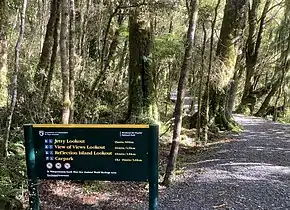 In February 2019 a major landslide blocked the northern access road to the Fox Glacier.[13] As part of a $3.9 million government plan to offset this closure, the facilities at Lake Matheson were improved, linking it to the township with a cycling/walking trail from Cook Flat.[14] A neglected track leading from the eastern side of the Lake Matheson Walk to a circuit around Lake Gault, an 8 km return trip, was upgraded to Easy status.[15]