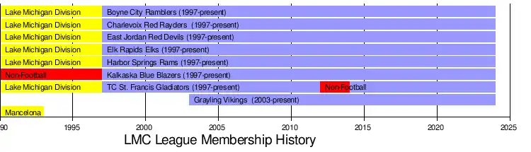 In 1993, Mancelona dropped to the smaller Ski-Valley for all sports. The Great Northern Conference dissolved in 1997, with most of the divisions retaining all their league memberships. The Lake Michigan Division, re-branded as the Lake Michigan Conference, with Kalkaska joining for football. The membership stayed the same until 2003, when Grayling, a former Lake Huron Division Rival of Kalkaska, left the Northeast Michigan Conference.[2] This gave the conference the 8 teams that it has today. In 2010, conference athletic directors voted to eliminate St. Francis from participating in football effective in 2012. Elk Rapids and Grayling agreed to continue their series, while St. Francis will play two other LMC teams on a three-year rotation. The LMC also extended an invitation to St. Ignace High School to join. On January 14, 2011, it was announced that St. Ignace would join the Ski-Valley Conference.