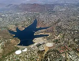 The reservoir was formed in 1894 with the construction of an earthen dam, and was known as La Mesa Reservoir.[2][3] In 1910 the dam and reservoir were bought by Ed Fletcher as part of his Cuyamaca Water Company.[4] Following the great San Diego County flooding in 1916 (associated with the rainmaker Charles Hatfield), the reservoir was the principal source of water for the city of San Diego.[5] In 1919, the dam was enlarged and the capacity of the reservoir greatly expanded.[3] The dam and lake were renamed in 1924 after James A. Murray, one of Fletcher's investors in the water company.[3] Fletcher sold the Cuyamaca Water Company, including Lake Murray, to the La Mesa, Lemon Grove and Spring Valley Irrigation District in 1926. The city of San Diego took over operation of the reservoir in 1950, and purchased the reservoir in 1960.[6]