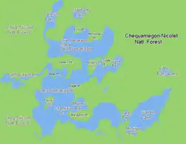 Lake Namakagon (pronounced NAM-uh-KAH-gun) is located in Bayfield County, Wisconsin. The lake is a large freshwater drainage lake that opens inlet and outlet of streams located between Lake Superior and Mississippi River system. The lake is located in the upper Namekagon river watershed as St. Croix river basin is the subwatershed of it. The lake derives its name from the Ojibwe language, and it means "Lake abundant with sturgeons." It is known for tourism and was the home of the legendary Anishinaabe Chief Namakagon.