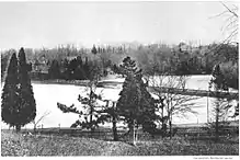 Lack of water was not the only problem the lake experienced. At times, the water was "clouded or turbid from rain-borne particles" as dredging was attempted to make the reservoir deeper. Increased mud and silt closed the lake for hundreds of days by 1912, accompanied by costs in the thousands of dollars for upkeep.[10][20][21][22][23][24][25] One Baltimore County newspaper in 1877 even described the lake as a "receptacle of filth" from nearby industry, including the railroad junction of the Northern Central Railroad and Green Spring Railway, and declaring that "Towsontowners never drink any water when they get into the city", even as others admired the lake as a "charming scene."[26][27][28]