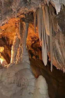 ![]() A merged stalactite and stalagmite in the Lake Shasta Caverns. | |