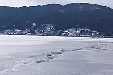 Lake Suwa is the site of a natural phenomenon known as the "God's Crossing" (御神渡り, o-miwatari), large cracks that form in the winter across the surface of the frozen lake. A vertical temperature gradient results in ice pressure ridges forming in the surface ice, reaching heights of 30 centimetres (1 ft) or more.[1]