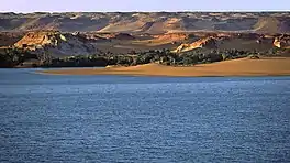 Lake Yoa is the most famous, and second largest of the Lakes of Ounianga, a series of Lakes in Borkou-Ennedi-Tibesti Region basin of northeastern Chad. It is located in the Ounianga Kebir about 40 km west of Ounianga Sarir. These lakes are remnants of a much larger lake which occupied this basin during the African Humid period which lasted from approximately 15,000 to 5,500 years before present. There are currently 15 lakes in the basin with a total surface area of approximately 20 kilometres (12 mi) square.[1]