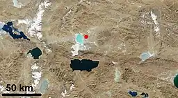 The lake is located in the Gangdise Mountains (also known as the Lunggar Mountains) deep in the Tibetan Plateau. It is one of 251 salt lakes in Tibet. It is divided into the northern (98 km²) and the southern (149 km²) sub-basins, which are linked by a narrow channel.[9] The southern part is semi-dry and appears white in satellite images. The northern part is fed from two inlets on east and on the west, by the snow melt of the Rianglinag Mountains (6,364 metres (20,879 ft)). The catchment area is 6,680 km², and the lake is surrounded by mountains with a height of 4,600–5,200 m above sea level. The lake is fed by rain, underground water and melting ice. Paleo-lake shore deposits in the area include sand banks, spits and barriers, and interbarrier lakes and lake shore deltas that form a cliff along the lake, in different tectonogeomorphological positions in the lake basin. This accumulation of sediments illustrates the dynamic nature of the lake system and its paleoclimatic characteristics.[10]