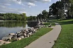 Lakeside Park Historic District, also known as The Stone Piers, is a nationally recognized historic district located in Lake View, Iowa, United States. It was listed on the National Register of Historic Places in 1991.[1] At the time of its nomination it consisted of four resources, which were all structures.[2] When Civilian Conservation Corps (CCC) Company VCCC 1776 was in town to develop Black Hawk State Park it also developed this municipal park as well. They built a rip rap berm for a seawall and two piers, and then filled in with dirt behind them to create the park. Both of the piers are constructed in the Park Rustic style that utilized uncoursed rough fieldstone from farms in the area. The west pier is U-shaped and extends roughly 34 feet (10 m) into the water. Two obelisk-like light posts are located at the entrance of the pier. The north pier is elongated and extends 82 feet (25 m) into the water. At its base is a broken circle of three stone and concrete benches. This pier is narrower than the other, and ends with a circular base that surrounds a tapered electric light shaft. The Park Rustic style is meant to blend into its natural surroundings.[2] The rip rap seawall and the piers appear to emerge naturally from the shoreline.