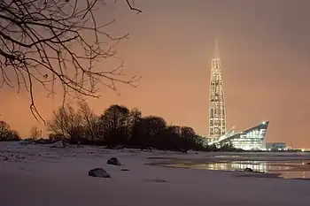The predecessor of the tower, the Okhta Center, was originally planned to be more centrally located in the city center of St. Petersburg. As the historical center has been a World Heritage Site since 1990, the World Heritage Committee opposed the construction of the 400-metre tower as it would affect the cityscape of historic Saint Petersburg.[11] In December 2006 UNESCO World Heritage Centre Director Francesco Bandarin reminded Russia about its obligations to preserve it and expressed concern over the project. In 2007, the World Monuments Fund placed the historic skyline of St. Petersburg on its 2008 Watch List of 100 Most Endangered Sites due to the potential construction of the building.[12] Due to this sizeable backlash on the original proposition, the Okhta Center, which had been planned by Gazprom to be in front of Smolny Cathedral, was moved to Lakhta.[13] Plans for a new metro station in the area were announced in March 2012, the station was originally included in the 1980 city development plan of Leningrad, but had not been built.[14]