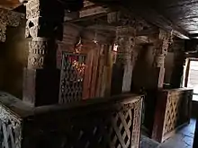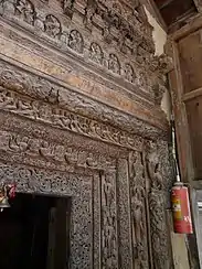 The temple is the oldest surviving structure of the former capital of Bharmour, also referred to as Bharmaur, Barmawar, Brahmor or Brahmapura in historic texts.[6][7] Its roof and walls have been repaired over the centuries and it looks like a hut, but the Himachal Hindu community has preserved its intricately carved wooden entrance, interior and ceiling that reflects the high art of late Gupta style and era. The design and a late Gupta script inscription below the brass metal goddess statue in its sanctum confirms its antiquity.[6][8] The wooden carvings include Shaivism and Vaishnavism motifs and themes.[9]