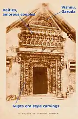 The entrance and the facade of the temple have been cleaned by the Archaeological Survey of India after 1950s, revealing the finer details that were not visible to Cunningham, Vogel or Goetz. It is similar to the late Gupta style, with three parallel panels surrounding the doorway flanked by river goddesses Ganga and Yamuna.[9] Each band is separated by a thin carving of a floral scroll carved on a convex wood surface. The outer wooden band consists of reliefs of single females standing in tribhanga posture and of amorous couples. The middle wooden band features Ganga standing on makara on left and Yamuna standing on tortoise on right, with their attendants. Above them are a series of Hindu deities, including Shiva with Nandi, Vishnu Vaikunthamurti, four armed Vishnu and Skanda (Kartikeya). A goddess and god in this panel are not identifiable because their iconographic signs are too eroded. The inner panel forms the door frame of the entrance. The inner panel is carved with natural motifs such as leaves and flowers, two peacocks with their beak joined, and a pair of amorous couples in a mithuna scene.[9][18][17]